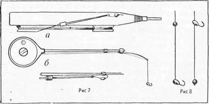 Какую применять оснастку? Еслиэто начало или конец зимнего сезона иожидается хороший клев достаточно крупной рыбы, стартуют с такой оснасткой: леска диаметром 0,12 мм, средняя по размеру мормышка. Об этом подробно будет сказано в следующих главах. Тут только надо отметить, что на соревнованиях спортсмены пользуются лесками в диапазоне диаметров от 0,08 до 0,15 мм. Размеры и цвет мормышек зависят от характера и активности клева, погодных условий, вида рыбы и т.Pд.